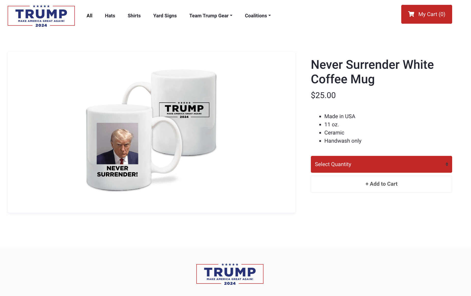 Eski ABD Başkanı Donald Trump, 2020 Başkanlık Seçimleri'nde Georgia seçimini etkilemesine yönelik davada çekilen sabıka fotoğrafını 2024 Başkanlık Seçimi'ndeki kampanyasına maddi kaynak yaratmak için kullanıyor. Tarihe geçen fotoğraf, kahve kupası, tişört gibi ürünlere basılarak satışa sunuldu.