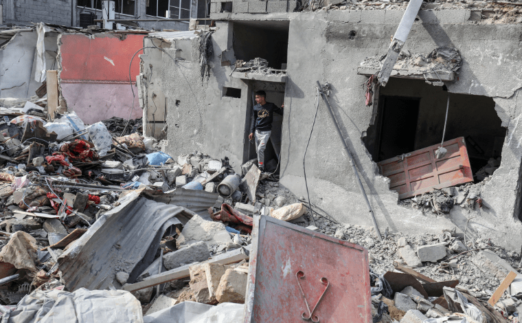 Refah kentine düzenlenen saldırıda Filistinli bir aileye ait bina yıkılırken çevresindeki evler de ağır hasar gördü. Fotoğraf: AA