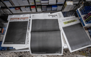 Öte yandan Yediot Ahronot, İsrail Hayom, Haaretz ve TheMarker gazeteleri, dünkü baskılarında ilk sayfalarını siyah yaptı ve ‘İsrail demokrasisi için kara bir gün’ diye yazdı. Jerusalem Post muhabiri Lahav Harkov ise bunun bir reklam çalışması olduğunu söylerken, reklamı ‘Yüksek Teknolojili Protesto’ adlı bir grubun verdiği öğrenildi. Yüksek Teknolojili Protesto grubu, ülkenin geleceği için üzerlerinde sorumluluk hissettiklerini söyleyen bir grup teknoloji şirketi, girişimci ve yatırımcıdan oluşuyor.