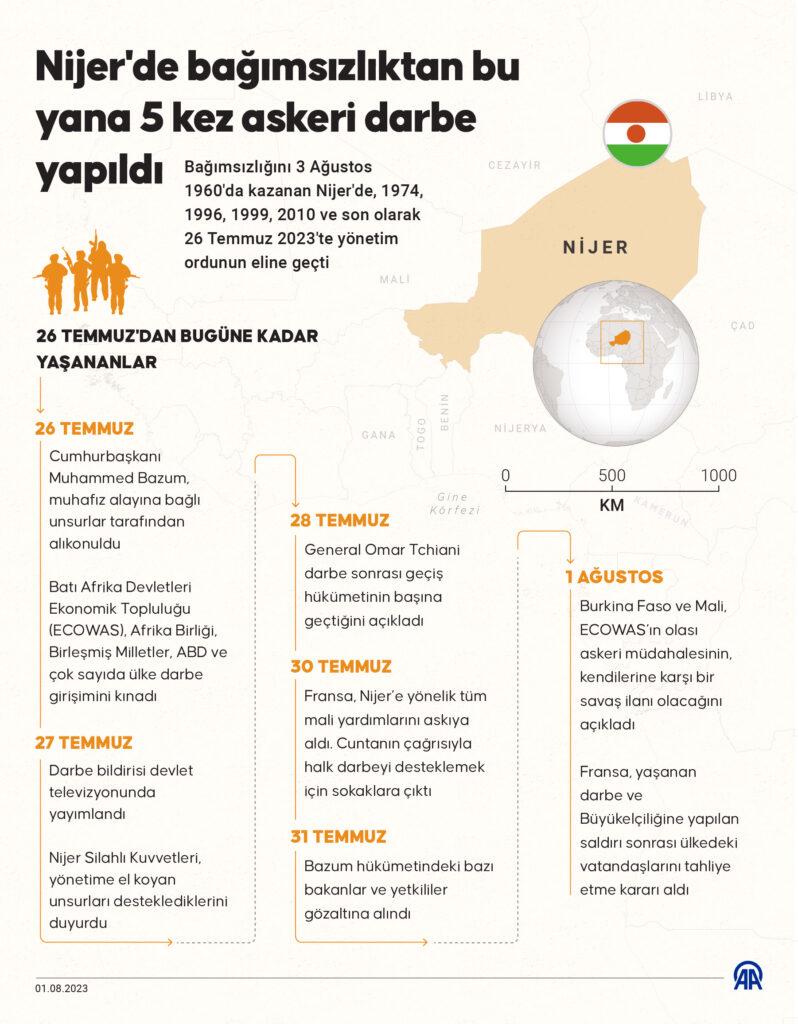 Bağımsızlığını 3 Ağustos 1960’da kazanan Nijer’de, 1974, 1996, 1999, 2010 ve son olarak 26 Temmuz 2023’te yönetim ordunun eline geçti. Grafik: Muhammed Ali Yiğit/AA