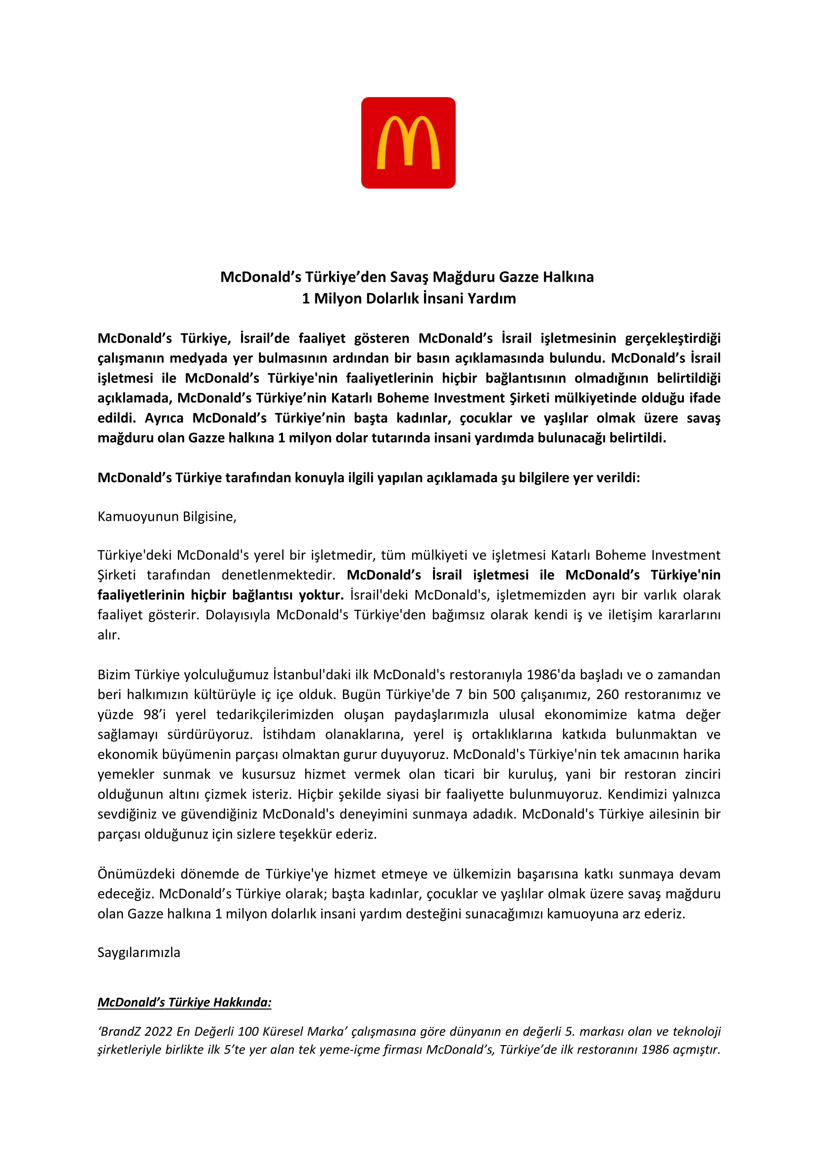 Katarlı bir şirket tarafından yönetilen Türkiye McDonald’s, kamuoyuna yaptığı açıklamada İsrail şubesi ile hiç bir bağlantısı olmadığını belirterek, Gazze’ye 1 milyon dolar göndereceğini açıkladı.