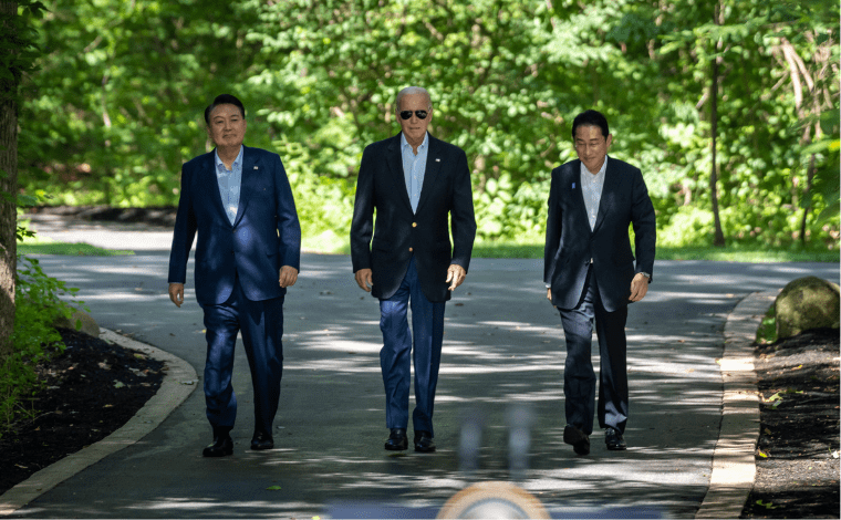 Biden’ın kritik zirve zincirinin ilk halkası ağustosun sonlarında Japonya Başbakanı Kişida Fumio ve Güney Kore Devlet Başkanı Yoon Suk Yeol ile bir araya geldiği Camp David zirvesiydi. Bir kere Camp David, İkinci Dünya Savaşı sırasında ABD lideri Franklin Roosevelt’in İtalya’yı savaş dışı bırakmak için müttefiki İngiltere Başbakanı Winston Churchill ile planlar yaptığı yerdi. Sonra 1978’te dönemin Mısır Cumhurbaşkanı Enver Sedat ile İsrail Başbakanı Menahem Begin de Camp David’de bir araya gelip barış anlaşması konusunda mutabık kalmıştı.