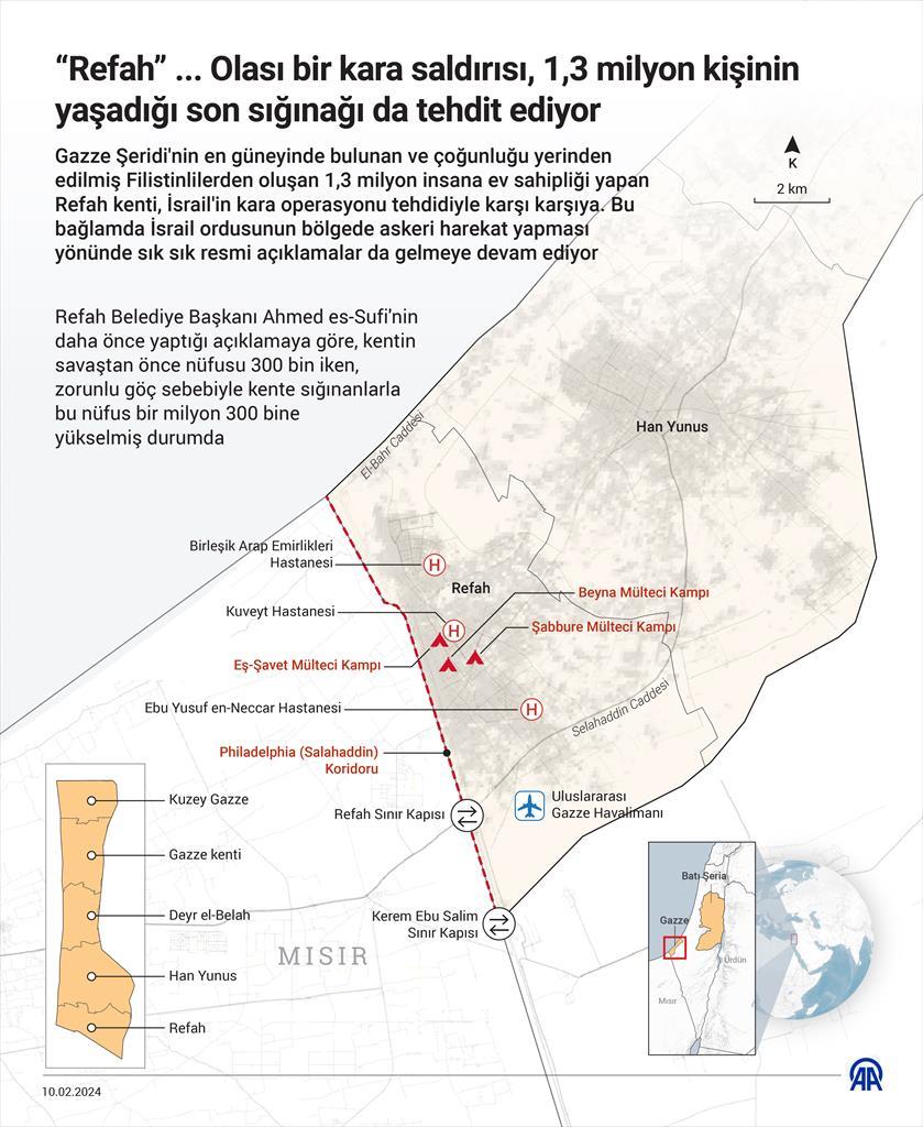 Gazze Şeridi’nin güneyinde Mısır sınırında yer alan Refah kenti, İsrail saldırıları nedeniyle yerlerinden edilen yüz binlerce kişinin kente sığınmasıyla birlikte 2,3 milyon nüfusa sahip Gazze’nin yaklaşık yarı nüfusuna ev sahipliği yapıyor. İsrail güçleri, Refah kentini sık sık hava saldırılarıyla hedef alıyor. İsrail’in Refah kentine kara saldırısı başlatması halinde sivillerin Gazze Şeridi’nde sığınacak yerlerinin kalmayacağından endişe ediliyor. İsrail’in 7 Ekim’den bu yana Gazze Şeridi’ne düzenlediği saldırılarda en az 12 bini çocuk, 8 bin 190’ı kadın olmak üzere 27 bin 947 Filistinli öldürüldü, 67 bin 459 kişi yaralandı. Enkaz altında hala binlerce ölü olduğu bildirilirken, halkın sığındığı hastane ve eğitim kurumları hedef alınarak sivil altyapı da tahrip ediliyor.