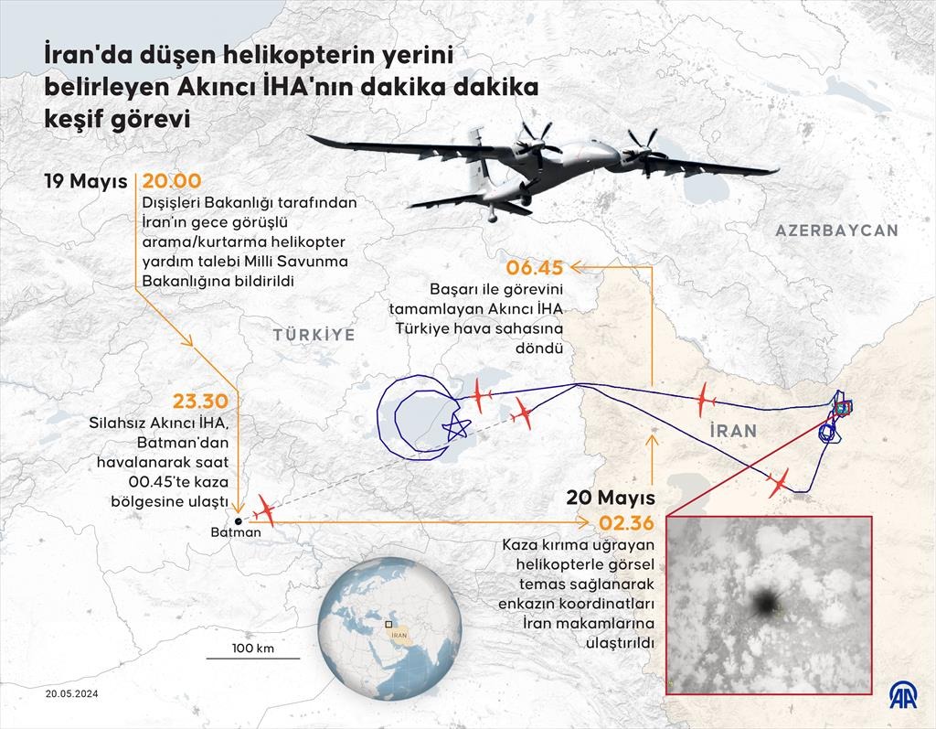 Fotoğraf: Tasnim İran Cumhurbaşkanı İbrahim Reisi ve Dışişleri Bakanı Hüseyin Emir Abdullahiyan’ın baraj açılışı için gittikleri Azerbaycan’dan dönüş için bindikleri helikopter mezarları oldu. Hava kötü, bindikleri araç 1979 öncesine ait eski bir helikopterdi ve “teknik arıza” yaşanmıştı. Arama kurtarma ekipleri sık ormanlık alanda yağmur ve sis altında 15 saat arama yaptı. hava kararmaya başlayıp da sonuç alınamayınca Türkiye’nin gece görüşlü helikopterlerinden ve İHA’larından yardım alındı. Sonuç olarak Akıncı İHA’nın yardımlarıyla arama ekipleri kazanın yaşandığı bölgeye ulaşabildi. Ama araç tamamen yanmış, geriye sadece kuyruk bölümü kalmıştı. Yaşam izine rastlanmadı. Araçtaki herkes ölmüştü. İran’da beş günlük yas ilan edildi.