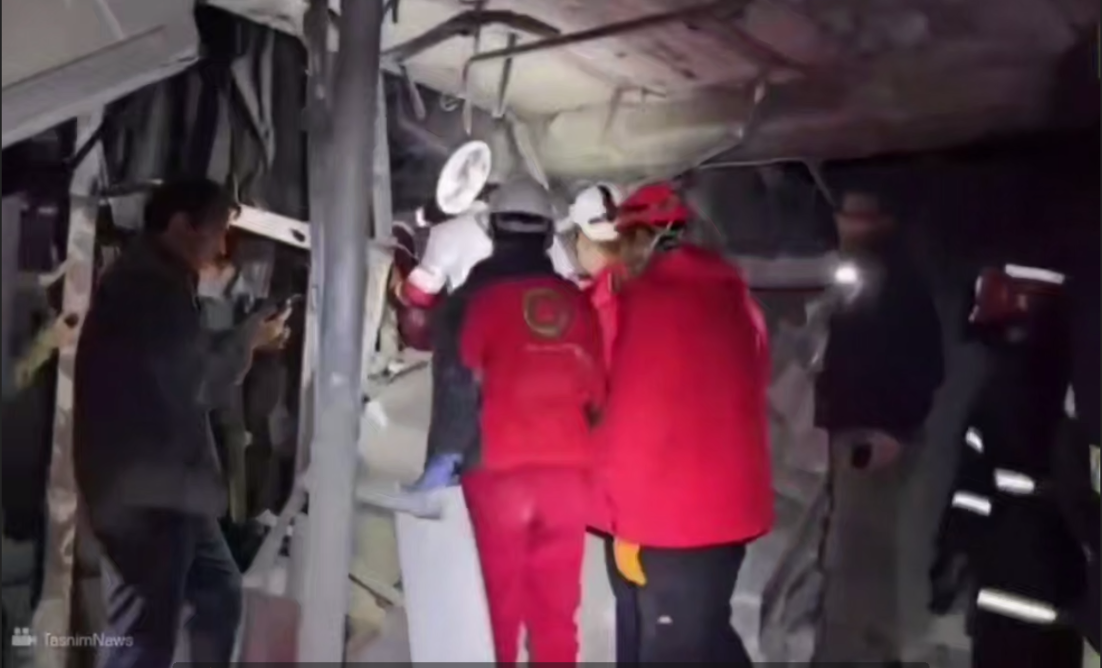 İran ilk yardım ekipleri vurulan binaya ulaştı. Ağır hasar alan ancak ayakta kalan bina içinde insanlar molozların altında kaldı. Ekipleri bu kişileri enkazın altından çıkarttı.