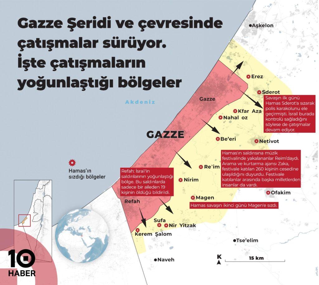 İsrail ordusu, Gazze çevresindeki bölgelerin kontrolünü yeniden sağladığını iddia etti. İddiayı, The Times of Israel gündeme getirdi. İsrail ordusu sözcüsü Daniel Hagari’nin sözlerini aktaran gazeteye göre, ordunun mühendislik birimleri çitlerin çevresindeki alanları temizledi. Ordu sözcüsü, hâlâ ‘İsrail topraklarında saklanan az sayıda’ Filistinli savaşçının bulunduğunu söyledi. Öte yandan İsrail Savunma Kuvvetleri (IDF) tarafından yapılan açıklamada İsrail’de 1500 Hamas üyesinin ölü bulunduğu kaydedildi.