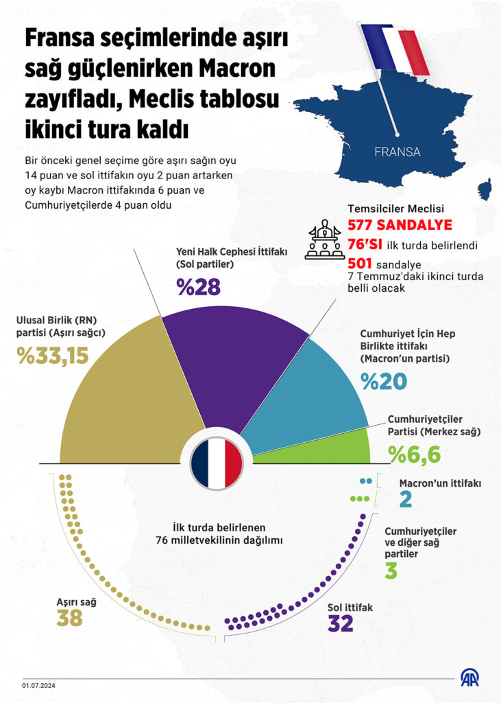 Fransa’da pazar günü yapılan erken genel seçimin ilk turunda, aşırı sağcı Marine Le Pen liderliğindeki RN partisi oyların yüzde 33’ten fazlasını toplayarak ilk sırayı almıştı. İçişleri Bakanlığının açıkladığı seçim sonuçlarına göre, aşırı sağ ittifak yüzde 33,15 oyla birinci, sol partilerin oluşturduğu Yeni Halk Cephesi İttifakı ise yüzde 28 ile ikinci sıraya yerleşmişti.