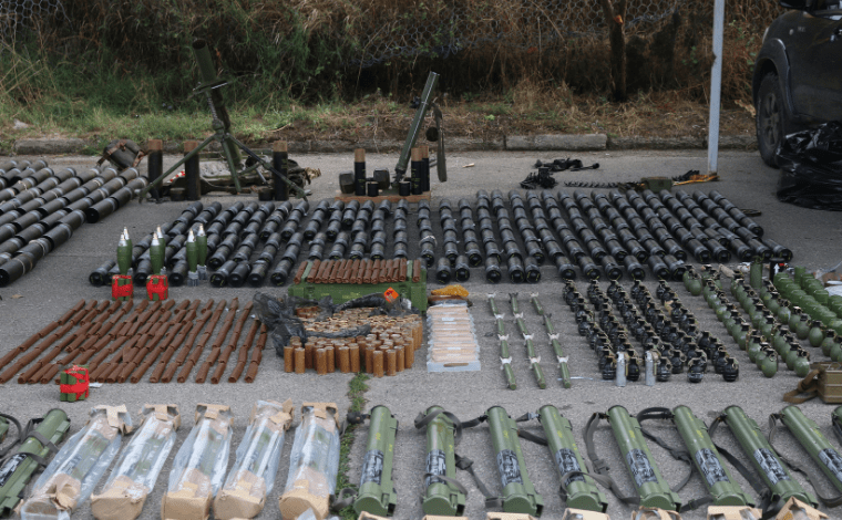 Kosova polisi, ülkenin kuzeyindeki Banjska’da silahlı Sırp grupla gün boyu devam eden çatışmalarda ele geçirdiği ağır silah, araç ve mühimmatları sergiledi. Fotoğraf: AA
