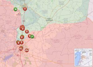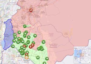 Günün sürprizi güneyde, Ürdün sınırındaki muhaliflerin silaha sarılması ve Deraa şehrini ele geçirip Şam’a doğru ilerlemeye başlamasıydı. Buradaki Esad ordusu tamamen dağıldı ve kaçtı. Yeşil renkli işaretler hep muhalif grupların ilerlemesini gösteriyor.