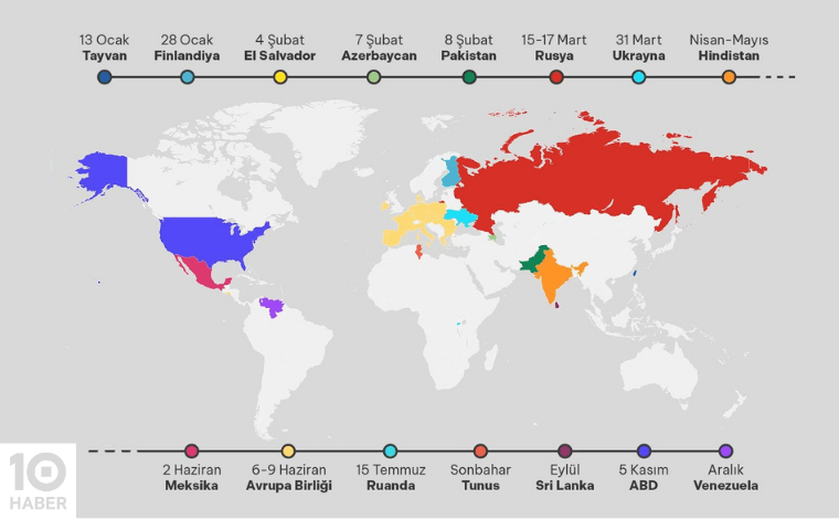 Aslında 70’ten fazla ülke seçime gidiyor ama 10Haber olarak bu seçimler içinde en öne çıkanlara haritada yer verdik. Harita: Pirsu Can Ergen/10Haber