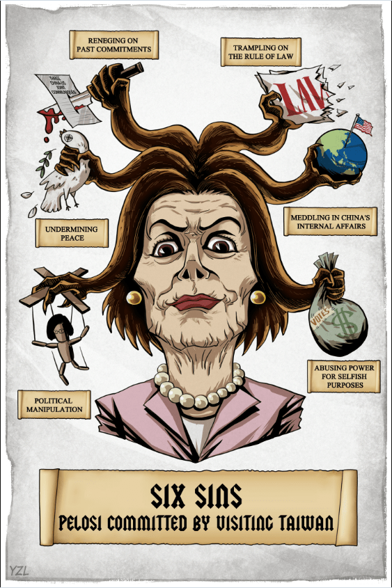 Çin haber ajansı Xinhua da ana karanın tepkisini yukarıdaki görselle vermişti. Karikatürde, kızgın bir ifadeyle resmedilen Pelosi’nin dağılmış saçlarında ise işlediği ima edilen “günahlar” yazıyor. Resimdeki “günahlar” şöyle sıralanıyor: “hukukun üstünlüğünün ayaklar altına alınması, geçmişte verilen sözlerden dönmek, barışı baltalamak, Çin’in içişlerine karışmak, manipülasyon ve gücün bencil amaçlar için kötüye kullanılması”