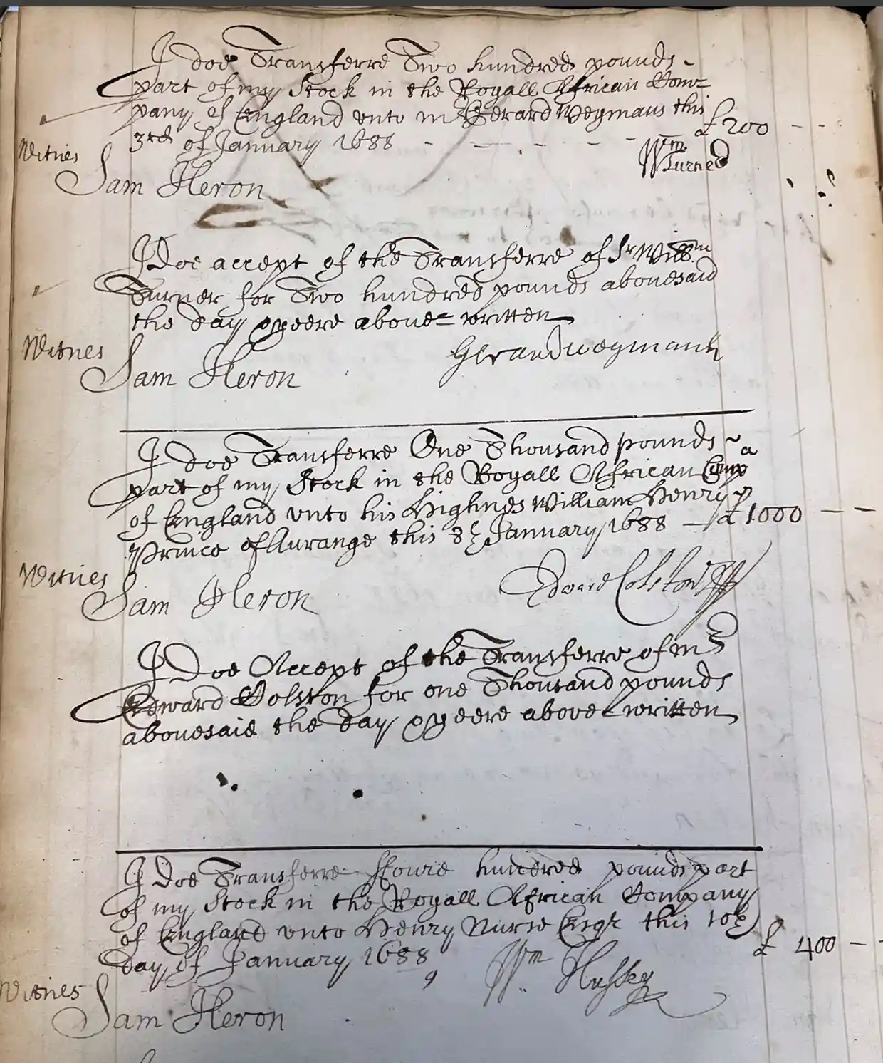 Edward Colston’un II. Charles’a hisse transferinin belgesi. Fotoğraf: Brooke Newman/RAC archive/Public Record Office
