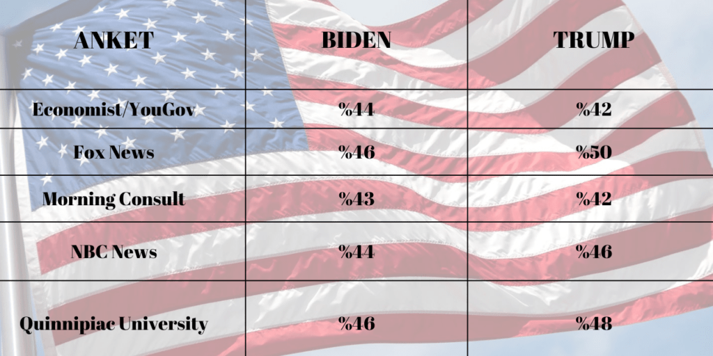 Geçen hafta yapılan The Economist/YouGov ve Morning Consult gibi diğer anketlerde ise durum tam tersiydi. Sonuçlar, Biden’ın Trump’ın bir ya da iki puan önünde olduğu yönündeydi.