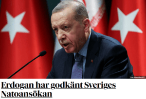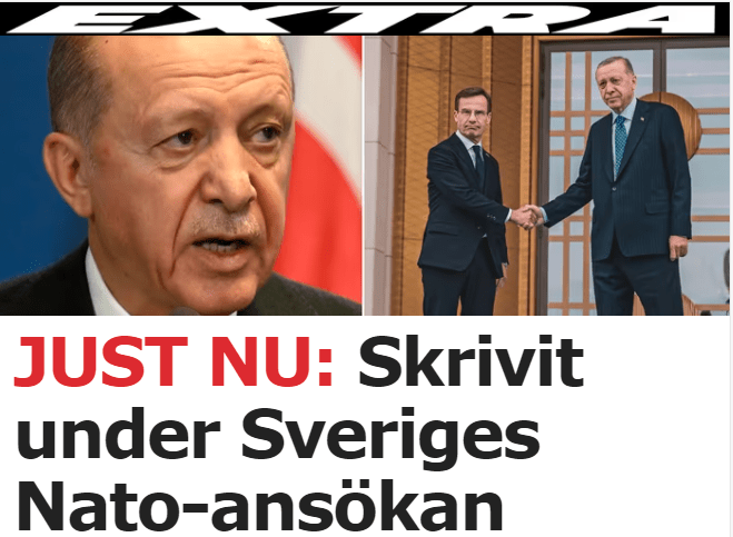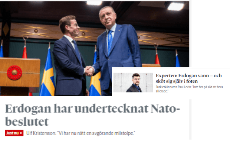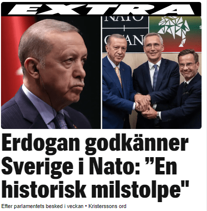 Erdoğan'ın İsveç'in NATO üyeliğini onaylaması İsveç basınında manşette yer aldı. Cumhurbaşkanı Tayyip Erdoğan’ın İsveç’in NATO üyeliğini onaylaması ve bunun akabinde kararın Resmi Gazete’nin mükerrer sayısında yer alması İsveç basınında geniş yer buldu.