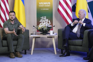 Biden ve Zelenski ikili görüşme çerçevesinde bir araya geldi. Ukrayna’nın NATO’ya katılacağı günü sabırsızlıkla beklediğini söyleyen Biden, Zelenski’ye “Direnciniz ve kararlılığınız tüm dünyanın görmesi gereken bir örnek oldu” dedi.