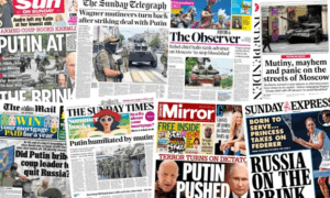 Observer, Rostov’daki Wagner tankının üstüne, “İsyancıların şefi ‘kan dökülmesini durdurmak için’ Moskova’ya tanklarını ilerletmeyi durdurdu” diye yazdı. Luke Harding’in, Prigojin önderliğindeki isyanın Putin’in yıllar sonra en zayıf durumda bıraktığını söylediği analize de manşette yer verildi.