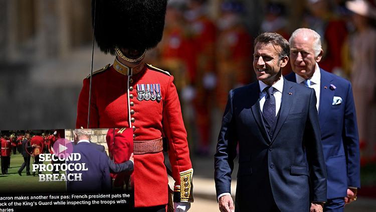 Macron, Kral Charles ile birlikte Grenadier Muhafız Alayı’na teftişte bulunurken bir muhafız subayının sırtına dokundu. İngiliz protokolüne göre Kraliyet Muhafızlarına dokunulmaması gerekiyor özellikle de tören esansında. Geleneklere aykırı bu hareket muhafızın şaşkınlıkla arkasına dönmesine neden oldu.