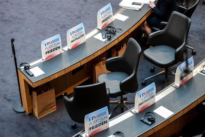 FPÖ’lü milletvekilleri masalarına ‘tarafsız alan’ ve ‘barış alanı’ yazılı pankartlar bıraktı. Fotoğraf: DHA