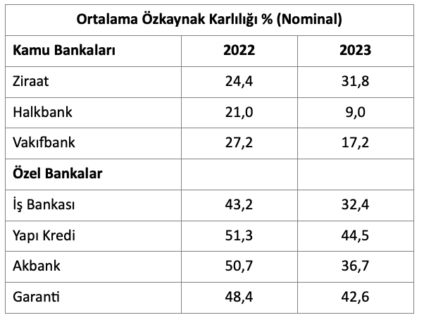 İkincisi kâr rakamlarının hacmine değil, ne kadar sermaye konduğuna ve bunun karşılığında ne kazanıldığına odaklanılmalı. Yani sermaye kârlılığına odaklanmak daha doğrudur. En büyük yedi bankanın son iki yıla ilişkin ortalama özkaynak (yıl içi dört çeyreklik dönemin ortalaması) kârlılığı şu şekilde değişiyor: