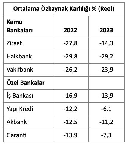 Tablodan da görüleceği üzere sektörün yüzde 70’inden fazlasını oluşturan bankaların sermayedarları koydukları sermaye karşılığında reel kazanç elde edememiş; aksine koydukları sermayeden kayıp yaşamışlar.