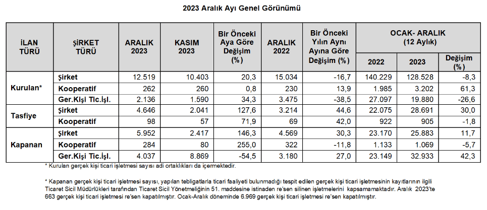 Aralıkta 12 bin 519, 2023’te 128 bin 528 şirket kuruldu. 2023’te kurulan şirket sayısı 2022’ye göre yüzde 8,3, kurulan gerçek kişi ticari işletme sayısı yüzde 26,6 oranında azalmış olup kurulan kooperatif sayısı yüzde 61,3 arttı. Aralık 2023’te, Aralık 2022’ye göre kurulan şirket sayısı yüzde 16,7 kurulan gerçek kişi ticari işletme sayısı yüzde 38,5 oranında azalmış olup kurulan kooperatif sayısı yüzde 13,9 arttı. Bir önceki aya göre kurulan şirket sayısı yüzde 20,3 kurulan kooperatif sayısı yüzde 0,3, kurulan gerçek kişi ticari işletme sayısı yüzde 34,3 arttı.