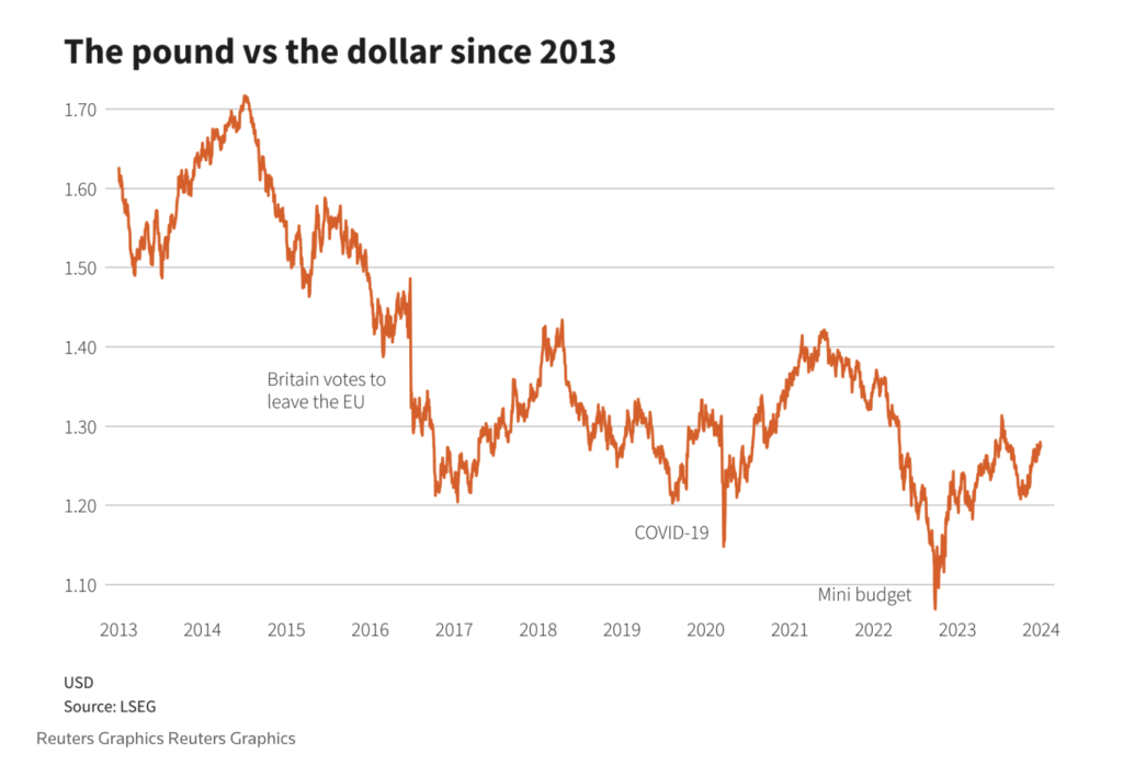 2024’te sterlinin yükselişi sürer mi? Bu pek o kadar mümkün görünmüyor. Bir kere Brexit, yani İngiltere’nin Avrupa Birliği’nden ayrılması İngiltere ekonomisine iyi gelmedi. Sterlinin son on yıldaki seyrini gösteren yukarıdaki grafiğin anlattığı açık: İngiliz parasındaki düşüşün arkasındaki temel dinamiklerden biri Brexit’ti. Bu ayrılık İngiltere ekonomisini olumsuz etkilemeye devam ediyor.