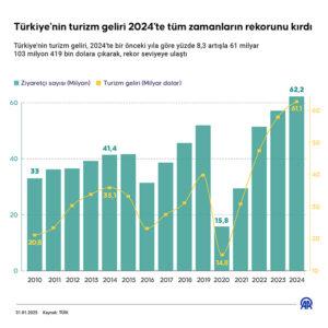 Türkiye'nin turizm geliri, 2024'te bir önceki yıla göre yüzde 8,3 artışla 61 milyar 103 milyon 419 bin dolar çıkarak, rekor seviyeye ulaştı.