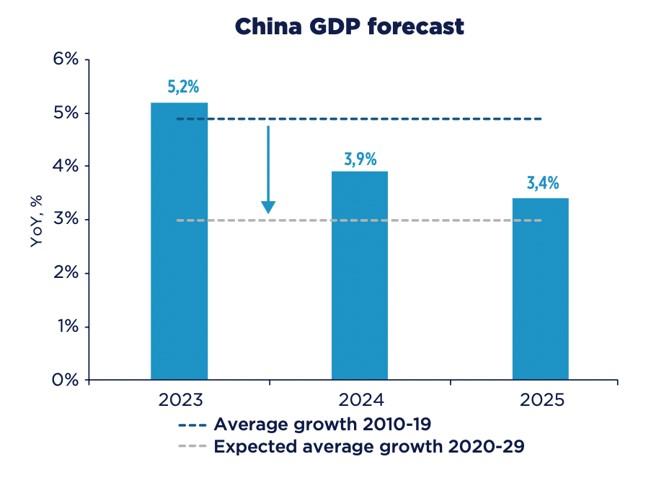 İkincisinden, Çin’den başlayalım. Çin ekonomisi iyi gitmiyor, bir zamanlar her yıl yüzde 10’un üzerinde büyüyen ülkenin büyüme oranı yüzde 5’e indi ve önümüzdeki yıllarda daha da yavaşlaması bekleniyor. Uluslararası yatırım şirketi Amundi’nin Çin’in büyümesine dair tahminleri şöyle: