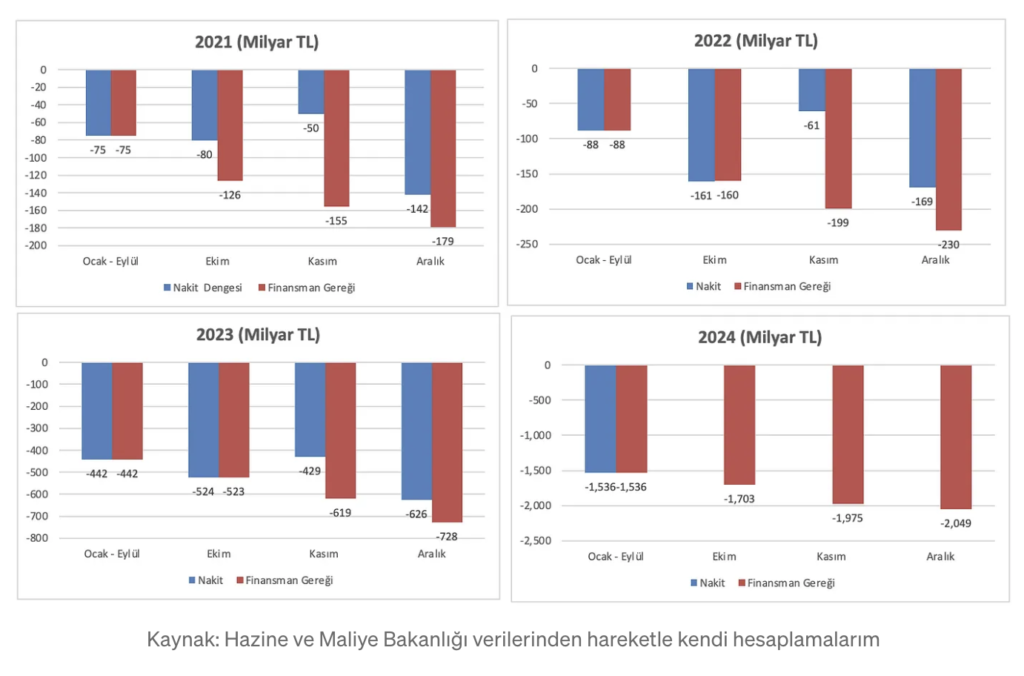 Bu durumda Hazine finansman programında yer alan çerçevede borçlanmaya giderse 2024 yıl sonu itibariyle 2,1 trilyon TL’nin üzerinde yani GSYH’nin yüzde 4,8’i civarında bir nakit açığı oluşacaktır.