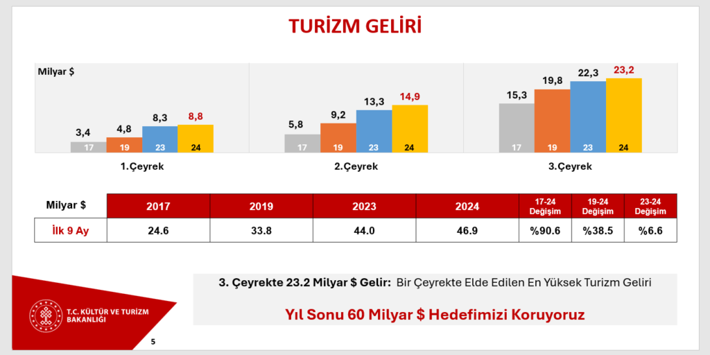 Turizm geliri ise temmuz, ağustos ve eylül aylarından oluşan üçüncü çeyrekte bir önceki yılın aynı çeyreğine göre yüzde 3,9 artarak 23 milyar 219 milyon 751 bin dolar oldu. Turizm gelirinin yüzde 14,7’si ülkemizi ziyaret eden yurtdışı ikametli vatandaşlardan elde edildi. Bu çeyrekte yapılan harcamaların 15 milyar 77 milyon 957 bin dolarını kişisel harcamalar, 8 milyar 141 milyon 794 bin dolarını ise paket tur harcamaları oluşturdu.