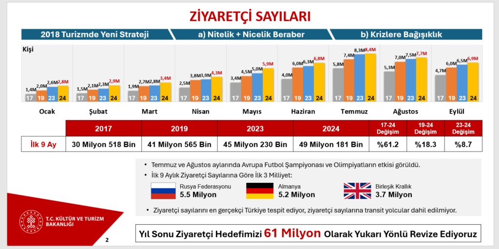 Kültür ve Turizm Bakanlığı, Avrupa Futbol Şampiyonası ve Olimpiyatlar nedeniyle temmuz ve ağustos ayında turist sayısı düşse de bu yılki 60 milyonluk turist hedefinin aşılacağını öngörüyor. Kültür ve Turizm Bakanı Mehmet Nuri Ersoy üçüncü çeyrekte Türkiye’ye gelen ziyaretçi sayısının geçen yıla göre yüzde 3,5 artarak 23 milyon 206 bin 579 kişiye, ilk dokuz ayda da 49 milyon 181 bine çıktığını belirterek yıl sonu ziyaretçi hedefini 60 milyondan 61 milyona çıkardıklarını söyledi.