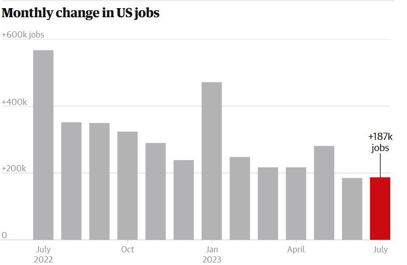 ABD'de tarım dışı istihdam temmuzda 187 bin ile beklentilerin altında arttı. Aylık istihdamın son 2,5 yılın en düşük seviyesine indiğini belirten uzmanlar, bunun Fed'in faizi son 22 yılın en yüksek seviyesine çıkarmasıyla işgücü piyasasının soğuması anlamına geldiğini söylüyor.
