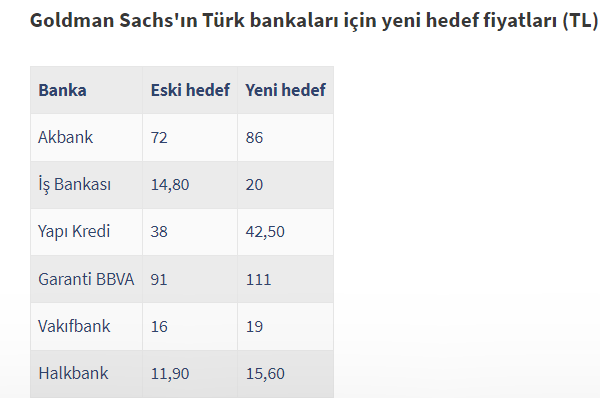 Bu analizler doğrultusunda Goldman Sachs Akbank için ‘Al’ tavsiyesi verirken hedef fiyatını 72 TL’den 86 TL’ye çıkardı.