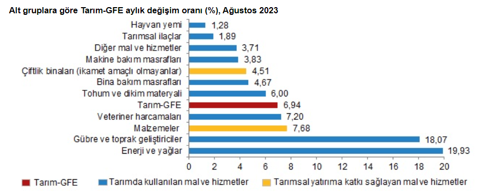 Aylık Tarım-GFE’ye göre 7 alt grup daha düşük, 4 alt grup daha yüksek değişim gösterdi. Geçen aya göre artışın düşük olduğu alt gruplar yüzde 1,28 ile hayvan yemi, yüzde 1,89 ile tarımsal ilaçlar oldu. Buna karşılık, aylık artışın yüksek olduğu alt gruplar yüzde 19,93 ile enerji ve yağlar, yüzde 18,07 ile gübre ve toprak geliştiriciler olarak hesaplandı.