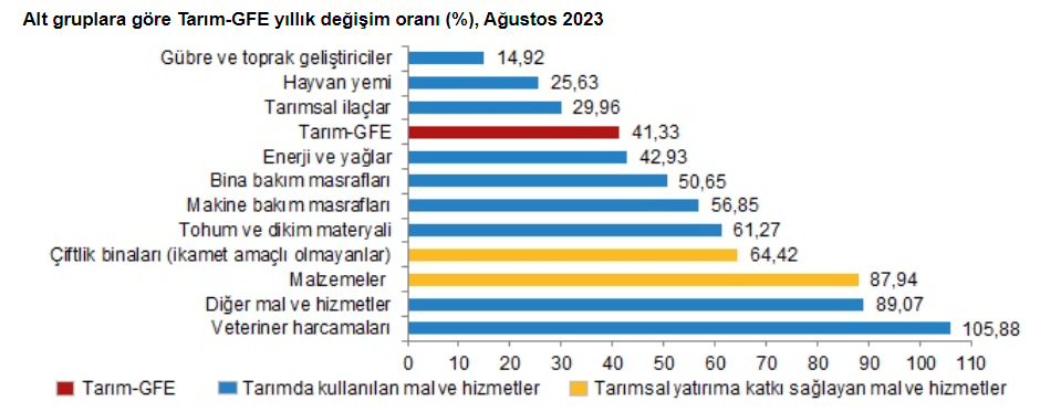 Yıllık Tarım-GFE’ye göre 3 alt grup daha düşük, 8 alt grup daha yüksek değişim gösterdi. Yıllık artışın az olduğu alt gruplar yüzde 14,92 ile gübre ve toprak geliştiriciler, yüzde 25,63 ile hayvan yemi oldu. Geçen yıla göre yıllık artışın yüksek olduğu alt gruplar ise yüzde 105,88 ile veteriner harcamaları, yüzde 89,07 ile diğer mal ve hizmetler olarak kayıtlara geçti.