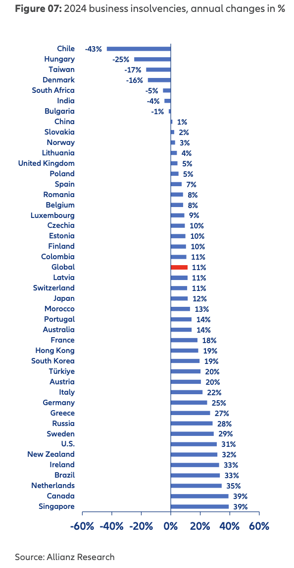 Allianz Trade Küresel İflas Raporu'na göre Türkiye’de de yüksek finansman maliyetleri ve ekonomik yavaşlamayla iflaslarda yüzde 20 artış görülmesi bekleniyor. İflaslarda en yüksek oranlı artış yüzde 39 ile Singapur'da görülecek.