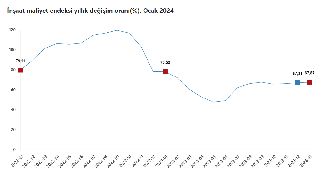 Artan inşaat maliyetleri nedeniyle konut fiyatları da yükseliyor. Artan inşaat maliyetleri nedeniyle konut fiyatları yükselirken Türkiye İstatistik Kurumu (TÜİK) Ocak 2024 dönemine ilişkin İnşaat Maliyet Endeksi verilerini açıkladı. TÜİK’e göre inşaat maliyet endeksi ocakta yıllık yüzde 67,87 artarken asgari ücretin işçilik ücretine yansımasıyla bir önceki aya göre aylık artış yüzde 15,70 gibi yüksek bir oranda gerçekleşti. İnşaatta aralık ayında 1.67 olan aylık işçilik endeksi, ocakta yüzde 41,95 oldu. İşçilik endeksinde yıllık artış ise yüzde 103,46 olarak gerçekleşti. Malzeme endeksi ise aylık yüzde 5,13, yıllık yüzde 53,29 yükseldi.