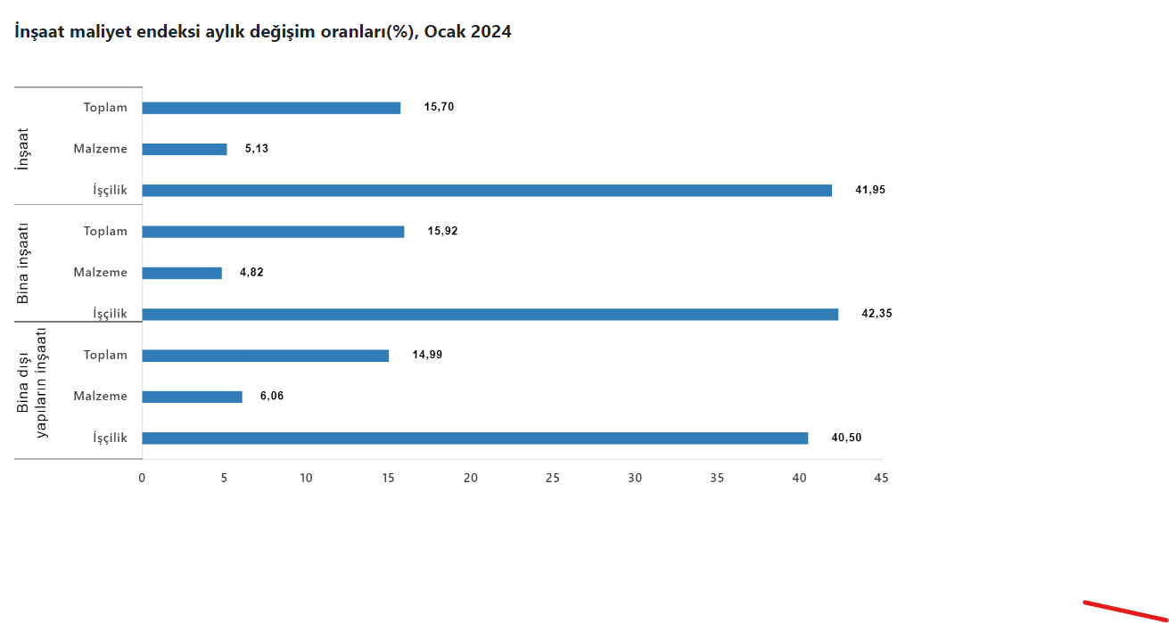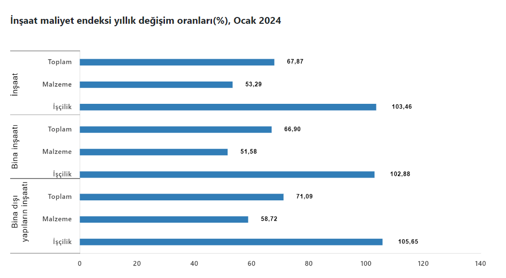 Bina inşaatı maliyet endeksi bir önceki aya göre yüzde 15,92 bir önceki yılın aynı ayına göre yüzde 66,90 arttı. Bir önceki aya göre malzeme endeksi yüzde 4,82, işçilik endeksi yüzde 42,35 artış kaydetti. Ayrıca bir önceki yılın aynı ayına göre malzeme endeksi yüzde 51,58, işçilik endeksi yüzde 102,88 arttı.