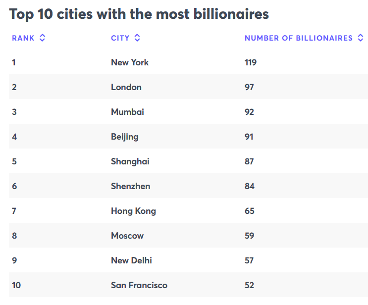 Hindistan'ın Mumbai şehri 92 milyarderle Çin'in Pekin şehrini geçerek Asya'nın en zengin başkenti unvanını aldı. New York 119 milyarderle şehirlerde dünya lideri olurken Çin 814 milyarderle ilk sıradaki ülke.