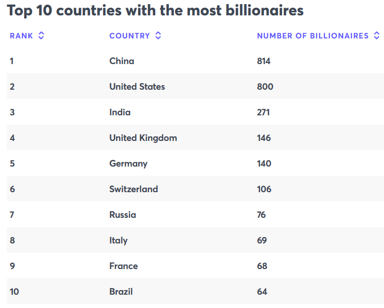 Ülke bazlı değerlendirmelerde Çin 814 milyarderle listenin başında bulunurken sayının 2022’ye oranla 155 kişi azaldığı gözlemlendi. ABD ise 800 milyarderle ülkeler sıralamasında ikinci sırada. ABD’yi 271 milyarderle Hindistan izliyor.