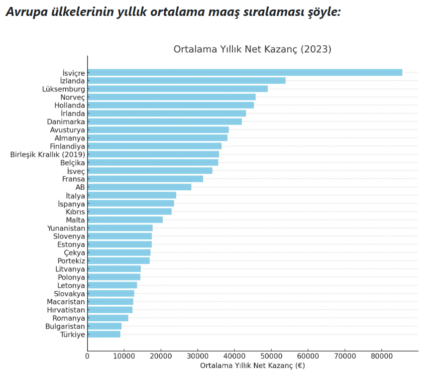 Rakamlara göre İsviçre 85 bin 582 euro yıllık ortalama net kazançla listenin başında yer alırken Türkiye 8 bin 968 euro ile son sırada.