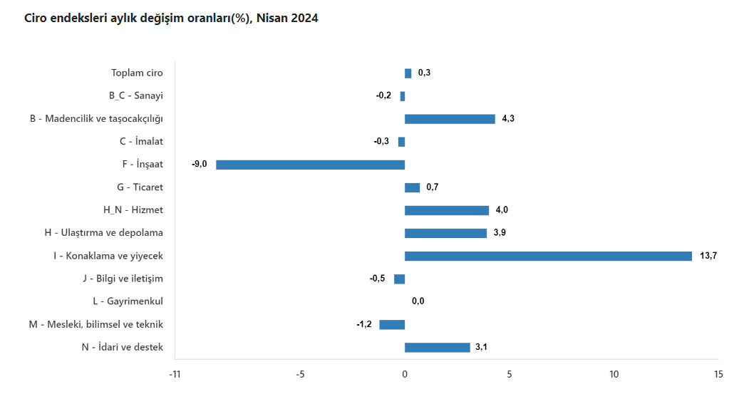 TÜİK ciro endeksine göre nisanda sanayi, inşaat, ticaret ve hizmet sektörlerinin ciro endeksi yıllıkta yüzde 71,9; aylıkta yüzde 0,3 artarken bu dönemde en büyük artış Ramazan Bayramı nedeniyle ulaştırma ve konaklamadan geldi. İnşaat ise geriledi.