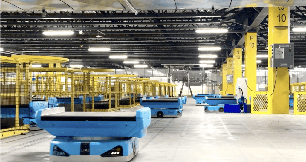 Orada, altı düzineden fazla robotik kol milyonlarca öğeyi sıralıyor, istifliyor ve birleştiriyor. Robotlar ayrıca kamyonlara yüklemek için paket arabalarını sıkıştırır, siparişler için müşteri kağıt poşetlerini paketlemeye ve ürünleri paketleme için yerinde taşımaya yardımcı oluyor.