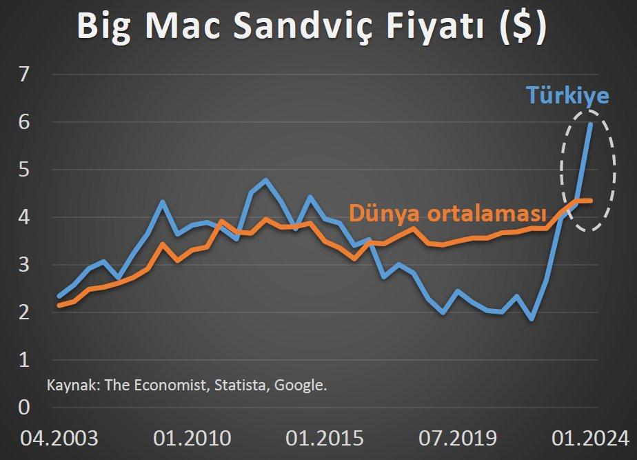 Kara, Temmuz 2023’te yaptığı paylaşımda da “Türkiye Big Mac fiyatını dünya ortalamasıyla kıyaslamak TL’nin değerine dair faydalı bilgi içeriyor TR fiyatı 2004-2016 arasında pahalı 2017-2022’de ucuz görünüyor. Son dönemde ise bizim fiyatlar dünya ortalamasına göre %12 pahalı. (Not: BigMac sandviç son fiyatını 120 TL aldım” demişti.