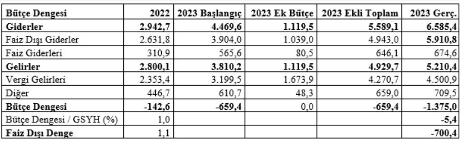 2023 yılı ek bütçesine göre giderler yükselecek, gelirler de aynı tutardaki artışla karşılanacak ve bütçede 659,4 milyar TL olarak öngörülen açık artmayacaktı. Ancak gerçek farklı gelişti ve açık da öngörülenin iki katı olarak gerçekleşti.