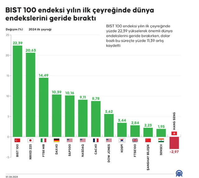 Bankacılık endeksindeki yükseliş ise, gün içinde yüzde 3'ü aştı. Yılın birinci çeyreğinde, dünya genelinde önemli merkez bankalarının ne zaman faiz indirimlerine başlayacağına yönelik belirsizliğin hakim olmasına rağmen söz konusu bankaların yılın geri kalanında politika faizlerini düşürmeye başlayacaklarına ilişkin beklentilerin yoğunlaşmasıyla dünya endekslerinde zirveler yenilendi. Küresel pay piyasalarında, özellikle yarı iletken çip ve yapay zeka alanında faaliyet gösteren teknoloji şirketlerinin beklentileri aşan 4. çeyrek finansal sonuçlarının ardından risk iştahı artarken, ABD Merkez Bankası (Fed) Başkanı Jerome Powell’ın ilk çeyrekte güvercin tonlu sözle yönlendirmelerde bulunması da söz konusu seyri destekleyen etkenlerden biri oldu. BIST 100 endeksi, dalgalı mart performansına karşın ilk çeyrekte dünya endekslerinin önünde yer aldı.