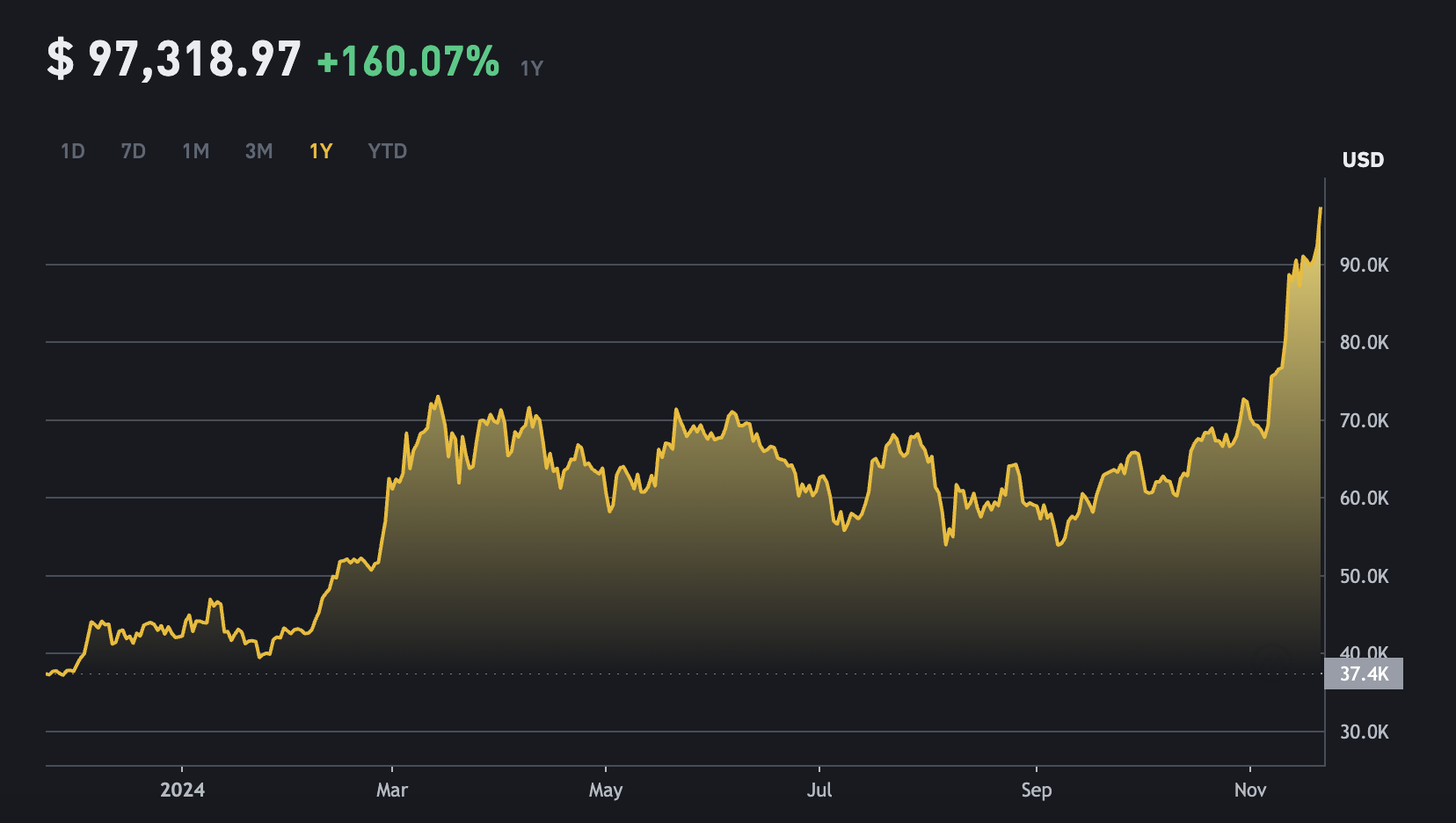 Bitcoin'in Donald Trump'ın ABD başkanlık seçimini kazanmasının ardından temposunu artıran koşusu hız kesmeden devam ediyor. Bitcoin yüzde 4,97 değer kazanarak 97.217 dolarla yeni bir rekor kırdı.