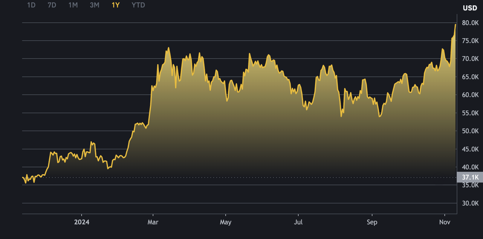 Bitcoin fiyatı Kasım 2023’ün sonlarında 37.712 dolar idi. 80.000 dolarlık rekor fiyat bir yıl içinde yüzde 121’lik bir artış olduğunu gösteriyor. Bitcoin Trump’ın başkan seçilmesinden bu yana ise yüzde 17 değer kazandı. ABD’nin yeni başkanı Donald Trump’un kripto paralarla ilgili düzenlemeleri gevşeteceğine ilişkin inanç, artan piyasa güveni ve Fed’in faizleri indirmeye devam edeceği beklentisi başta Bitcoin olmak üzere kripto paraları coşturdu.