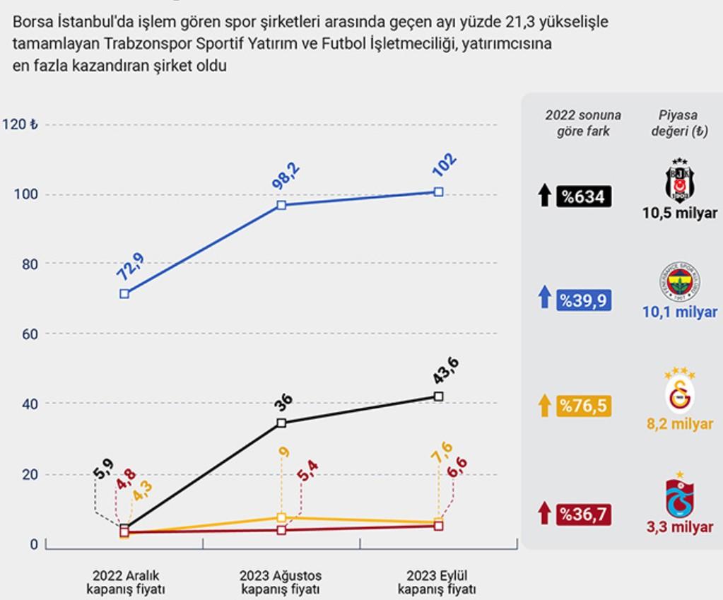 Spor kulüplerinin geçen yıl kapanış performanslarına bakıldığında yılın ilk 9 ayında en çok kazandıran Beşiktaş oldu. Geçen yılı 5,94 lirayla tamamlayan Beşiktaş’ın hisse fiyatı, eylülde yüzde 634’lük artışla 7 katını aştı. Bu dönemde, yatırımcısına Galatasaray yüzde 76,5, Fenerbahçe yüzde 39,9, Trabzonspor yüzde 36,7 kazandırdı.