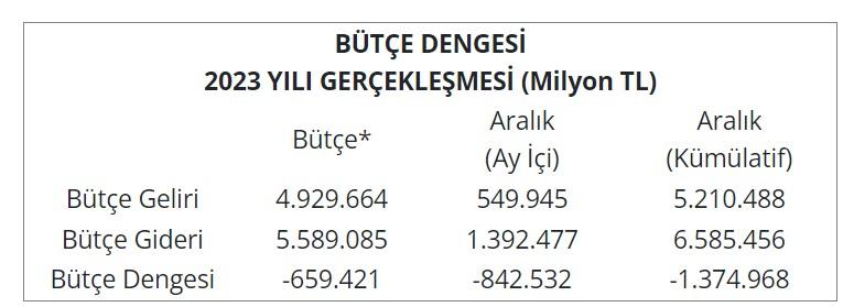 Hazine’nin aralıkta nakit açığı 197 milyar TL iken bütçe açığının 842,5 milyar TL olarak açıklanması dikkat çekti. Farkın kamu kurumlarının bir takım harcamaları tahakkuk ettirip ödemeleri bu yıla sarkıttıkları için nakit çıkışı olmamasından kaynaklandığı ifade ediliyor. Bütçe açığında bir önceki rekor temmuzda 219,6 milyar TL ile kırılmıştı. Aralıktaki rekor bu rakamın yaklaşık dört katı oldu. Aralıkta bütçe gelirleri 549 milyar 945 milyon TL olurken bütçe giderleri 1 trilyon 392 milyar 477 milyon TL ile tarihi zirveyi gördü. 2023 genelinde ise bütçe gelirleri 5 trilyon 210 milyar 488 milyon TL olurken giderler 6 trilyon 585 milyar 456 milyon TL olarak gerçekleşti.